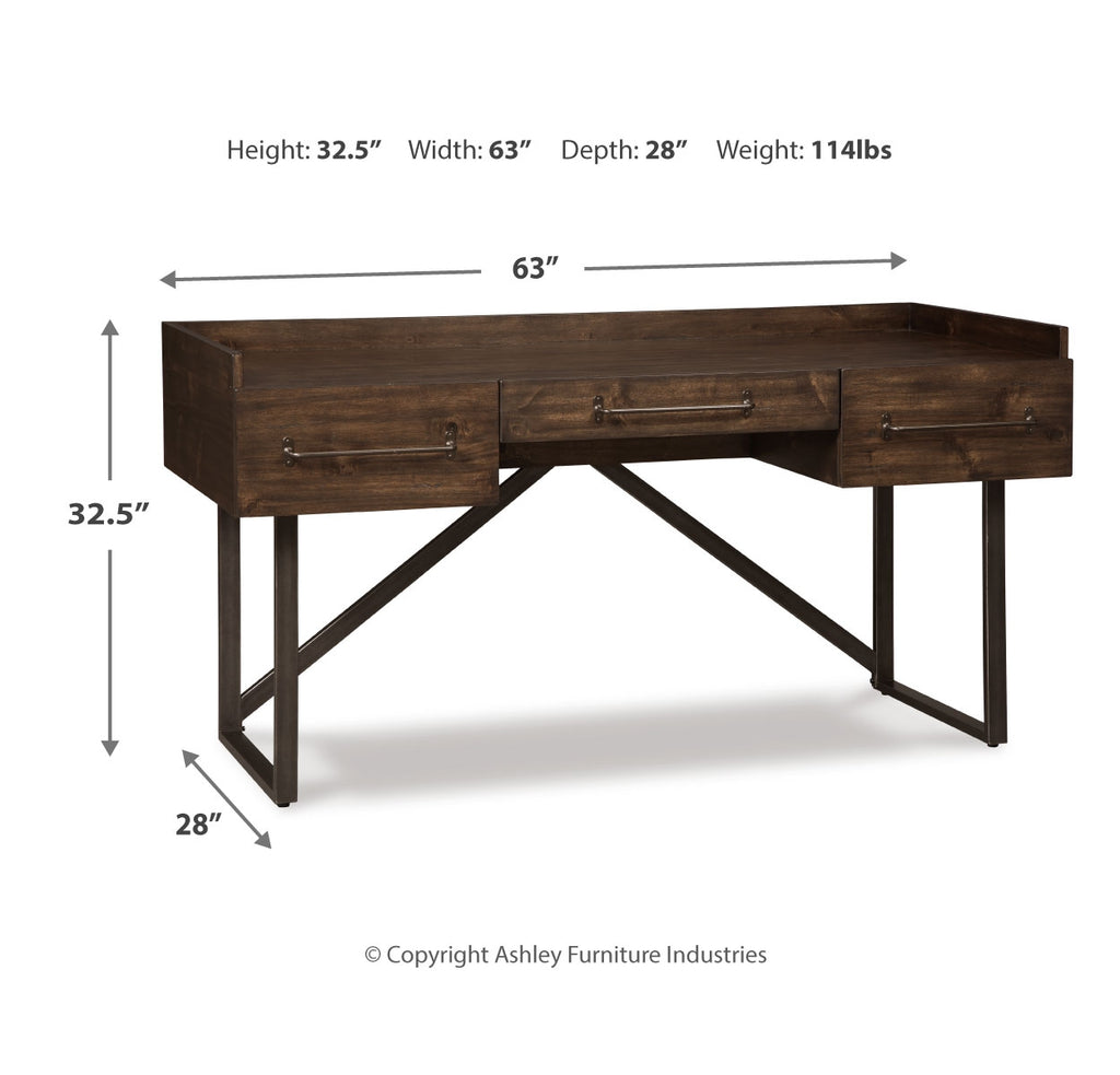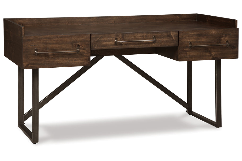 For fans of urban industrial design, this desk steals the show. Its top is crafted with a mix of acacia veneer and wood beautified with an oiled walnut-tone finish. A sleek tubular metal frame and linear, large-scale pulls pull it all together. The cutout shelf on the desk’s front side incorporates added dimension. | Product Features