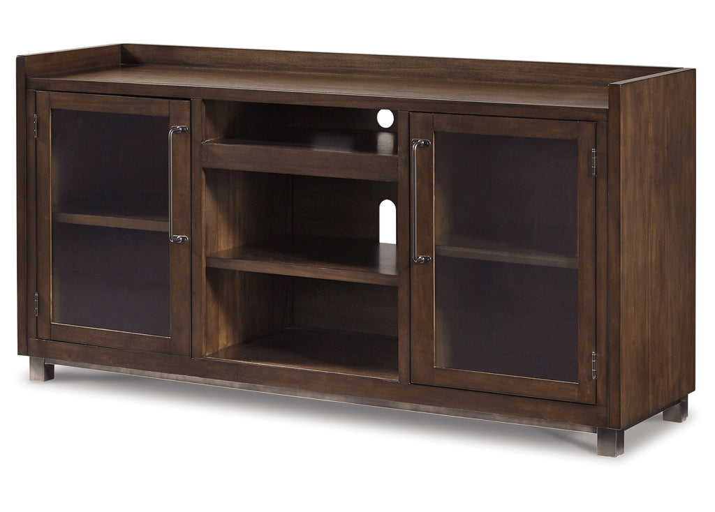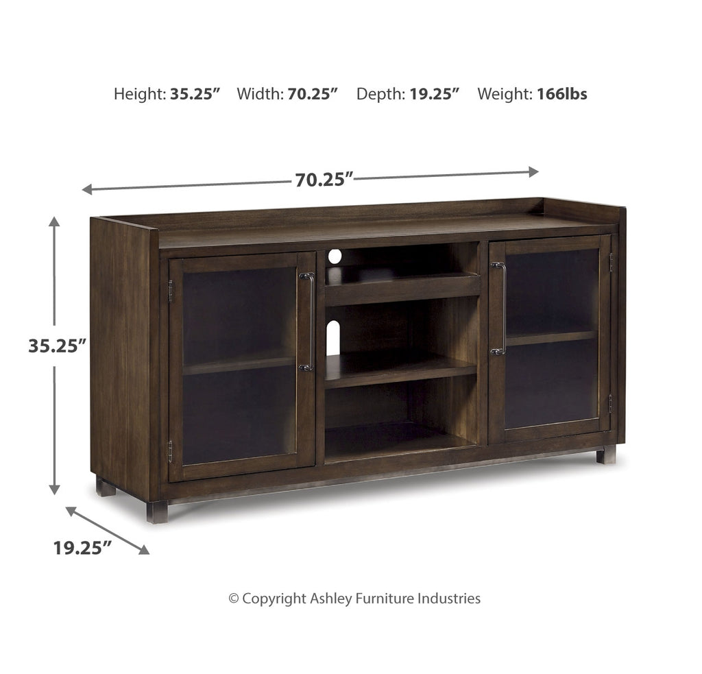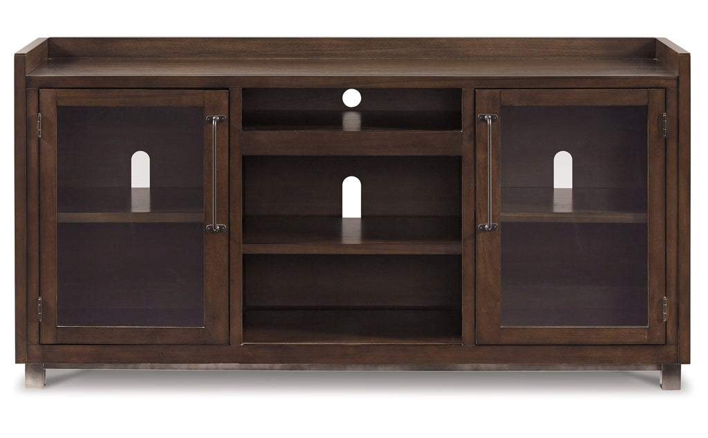 For fans of urban industrial design, this XL TV stand clearly steals the show. Its blend of acacia veneer and wood is beautified with an oiled walnut-tone finish for a highly contemporary aesthetic with grainy, earthy character. Infusion of dark bronze-tone metal takes the cool character to another level. And for your added viewing pleasure, this entertainment center is compatible with our electric fireplace inserts (sold separately). | Product Features