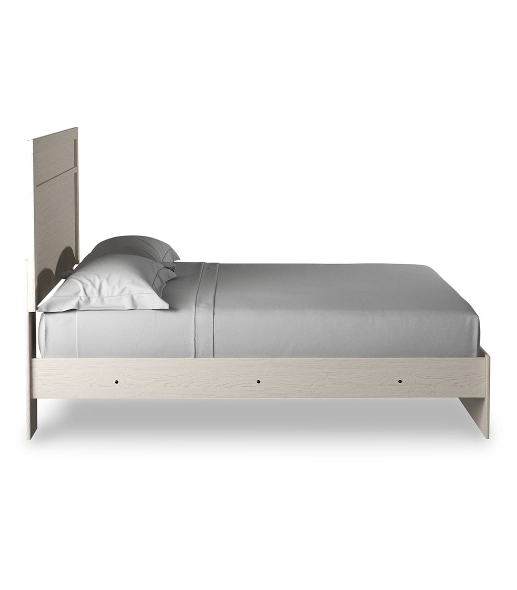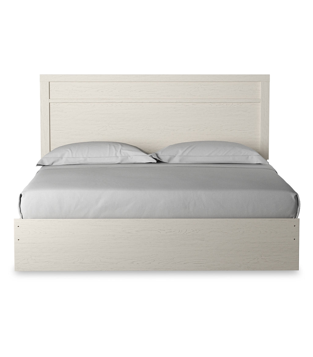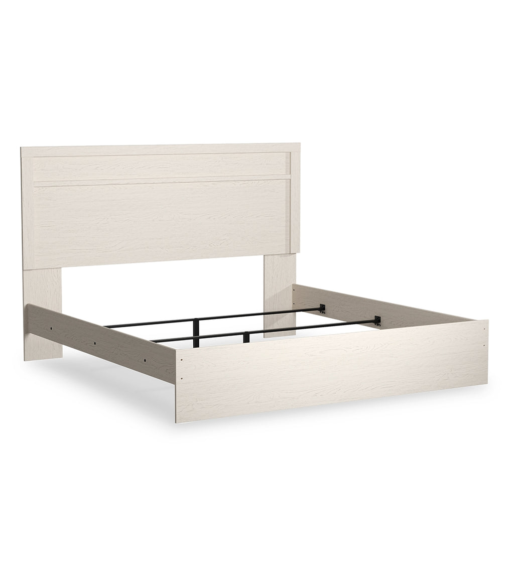 With its clean-lined look and modern attitude, this king panel bed is a fresh style awakening. A crisp, white hue over subtle replicated wood grain easily complements other furniture finishes. The simple, unadorned profile is given depth and dimension with the addition of plank-style moulding on the headboard—proof that beauty lies in the details. | Product Features