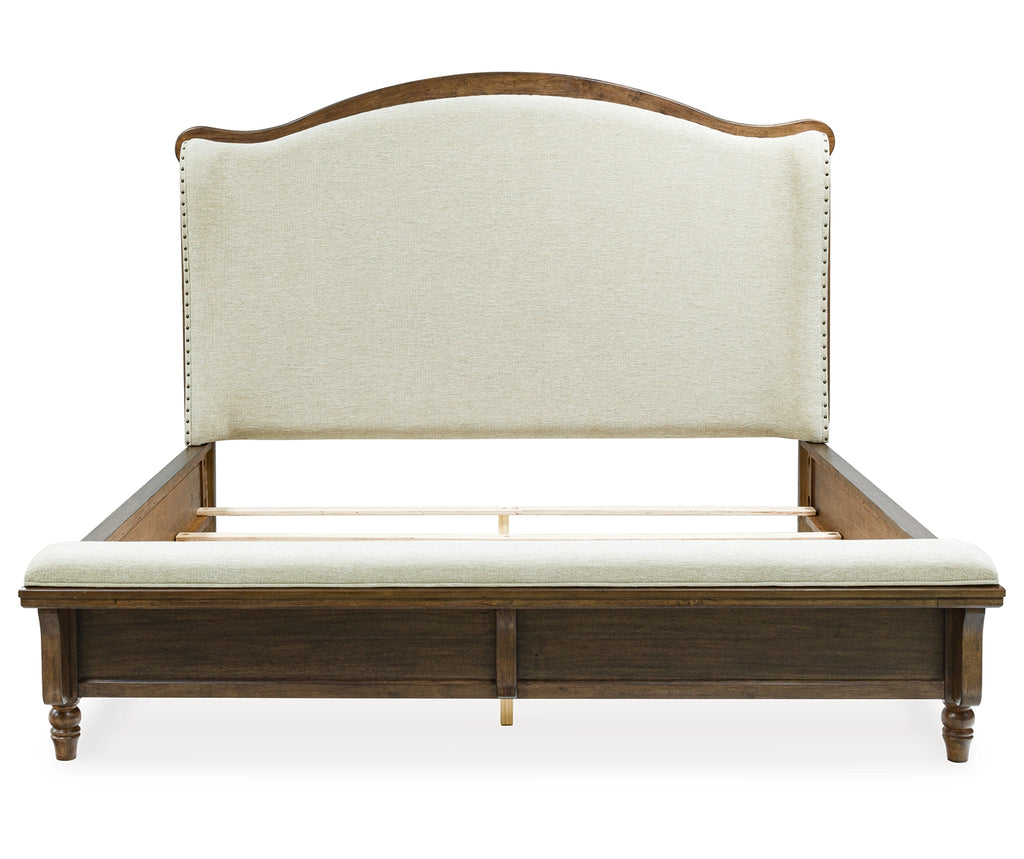 Includes upholstered headboard, panel rails and bench footboard with slats