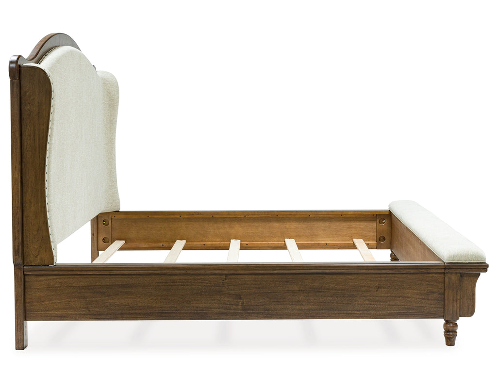 Traditional style doesn’t have to be stuffy. It can feel warm, inviting and beautifully in the moment. Case in point: this king upholstered panel bed. The alluring piece features a distinctive headboard with a shelter wing design. Its cushioned bench footboard provides the perfect place to sit and slip on your shoes. How's that for relaxed refinement?