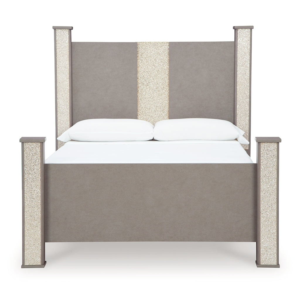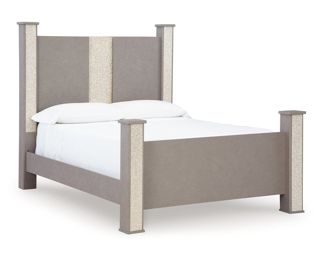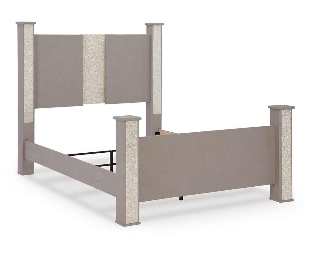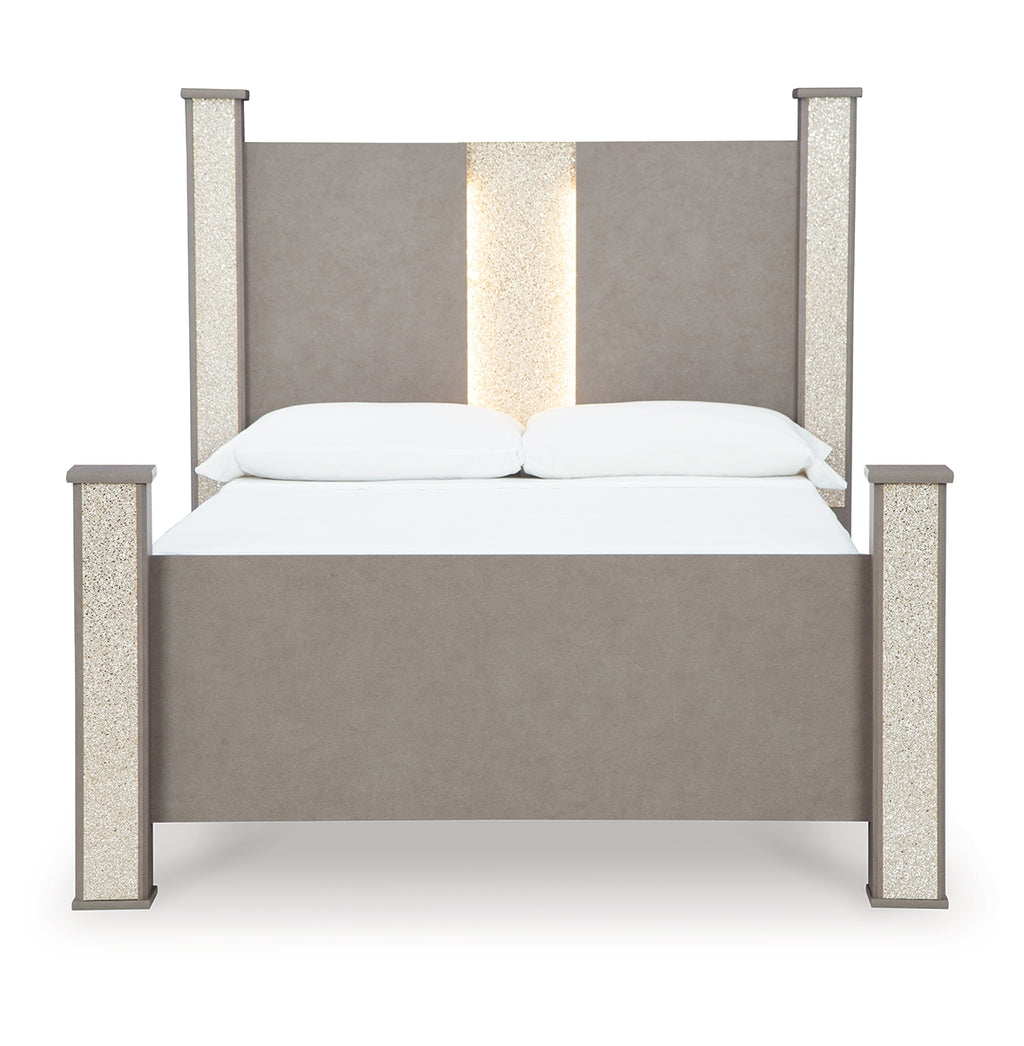 Love sleek and bold contemporary style? Drink in the beauty of this queen poster bed. The piece's eye-catching details include a leather grain look, glam glitter accents and remote-controlled LED lighting. Combined with the streamlined aesthetic, it's a simply stunning way to achieve the bedroom of your dreams. | Product Features