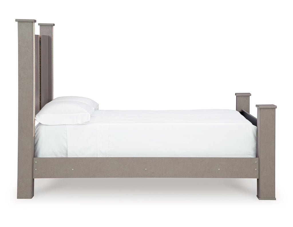 - Includes queen poster headboard panel, headboard posts, footboard and rails