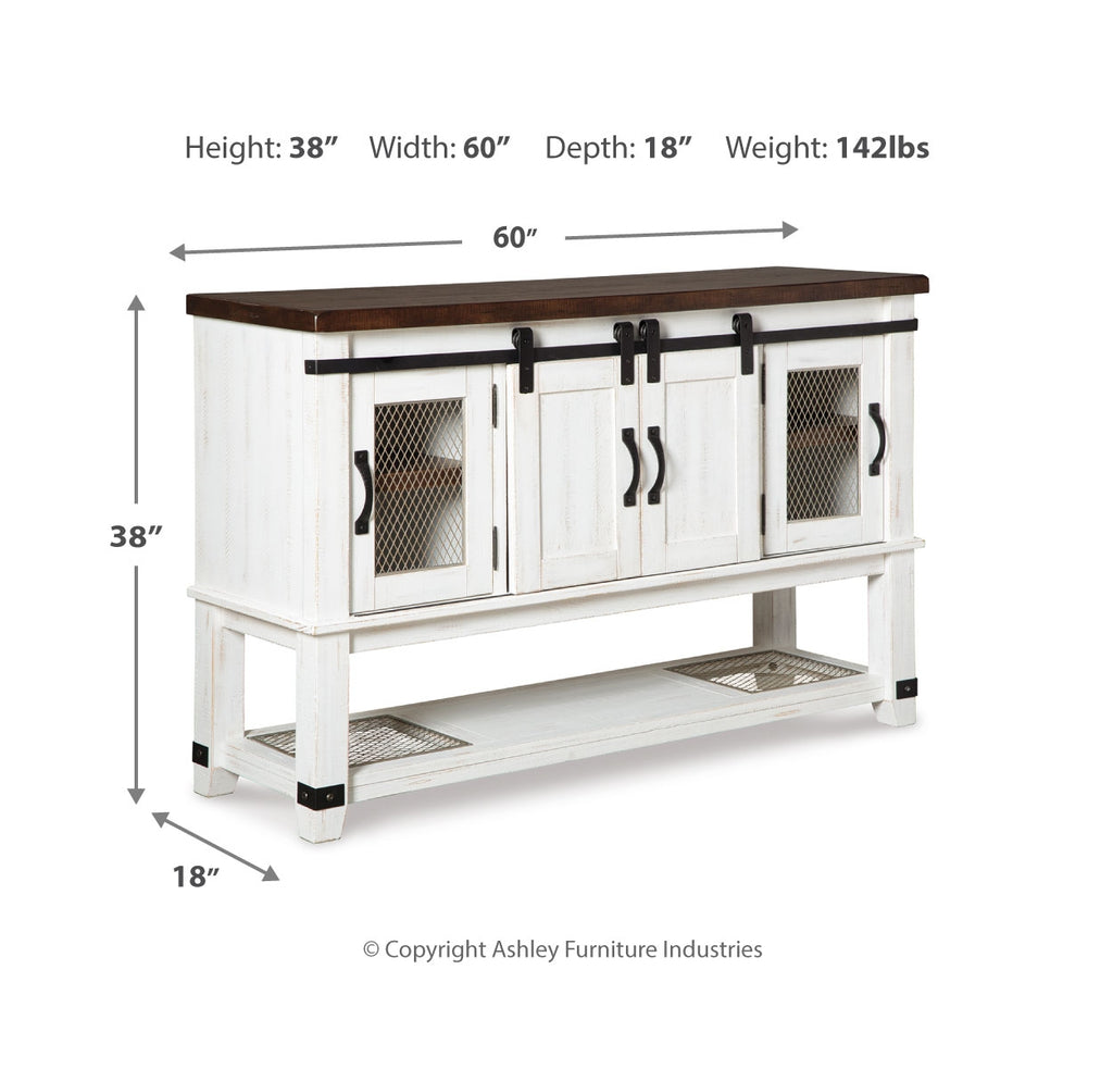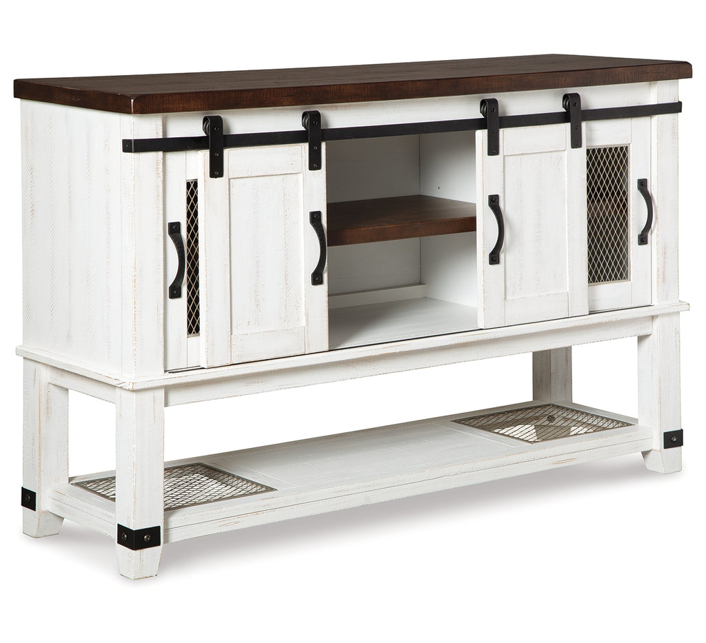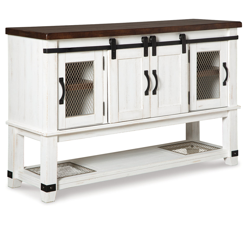 To those with an appetite for rustic farmhouse living, this server dishes out irresistible form and function. A pair of cabinet doors with mesh wire inlays add a countrified cool element. Sliding “barn doors” revealing even more shelved storage are right on trend. This server’s two-tone aesthetic pairs a distressed vintage white with an aged natural pine color top for twice the charm. | Product Features