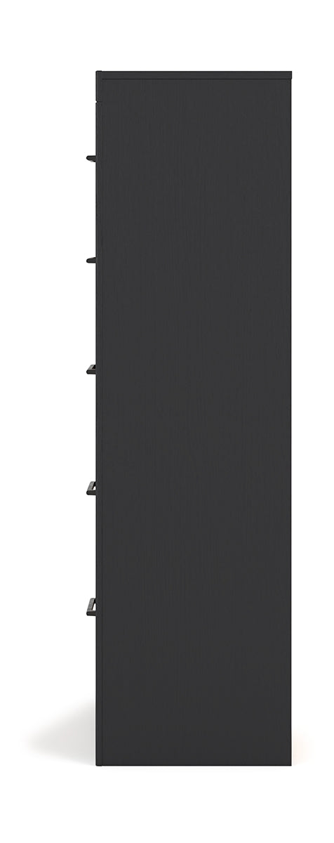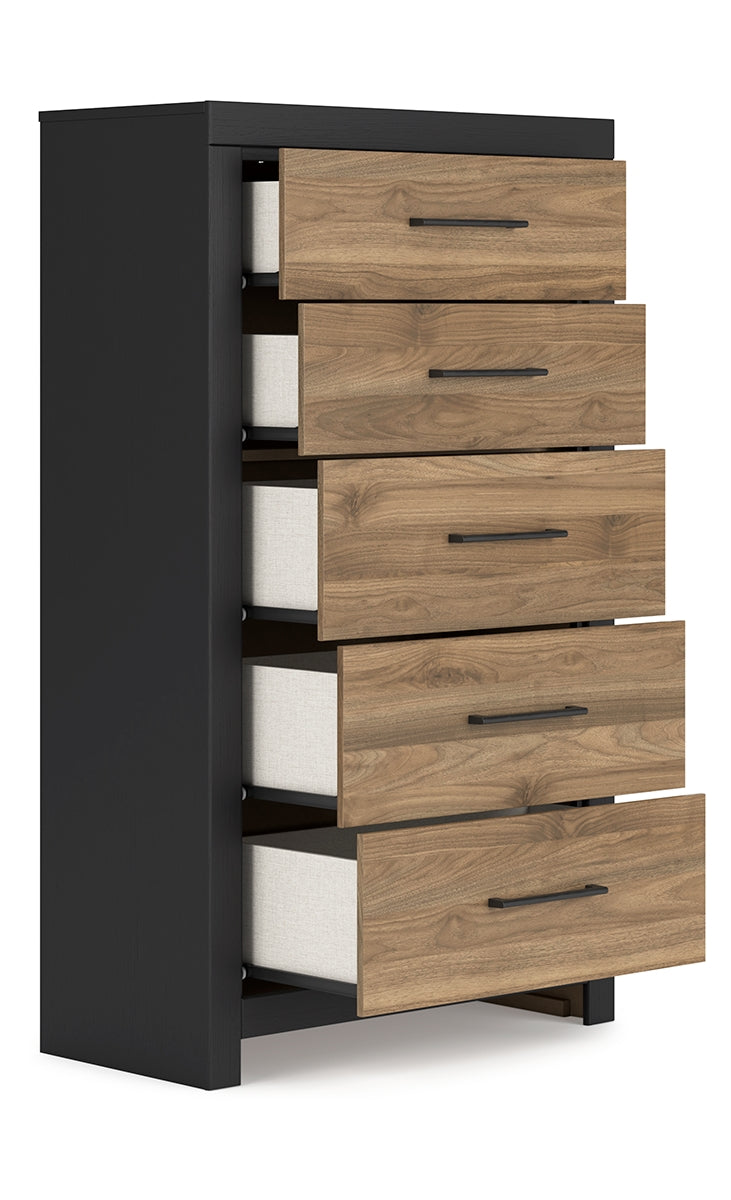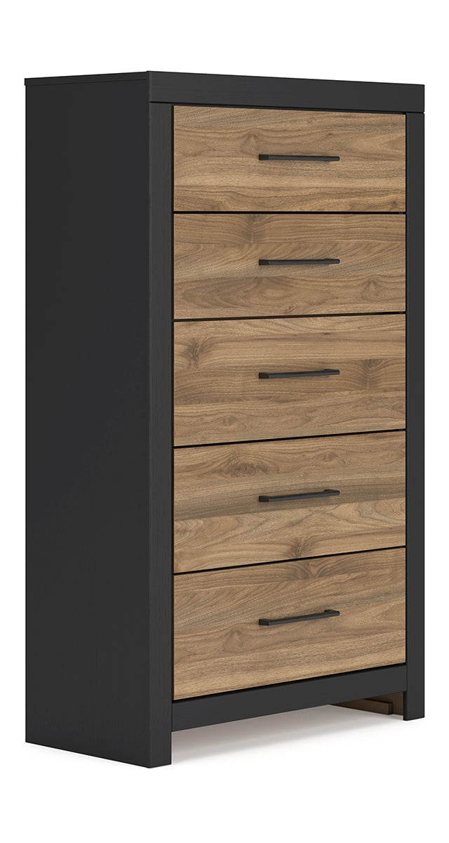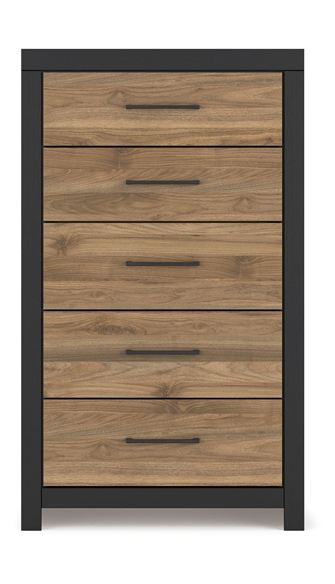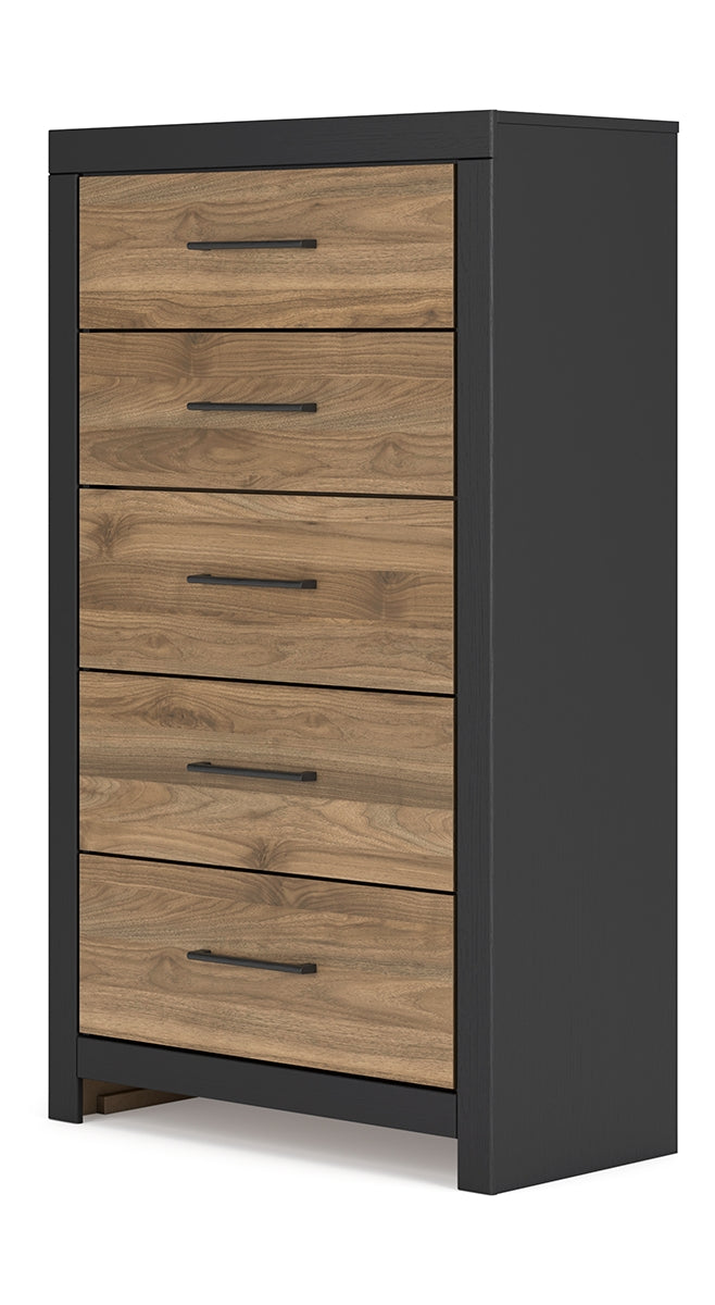 Relaxed yet striking, this chest of drawers brings casual beauty and function to your dream destination. You're sure to love its spacious drawers that glide open and offer plenty of storage for your wardrobe and spare bed linens. A delightful two-tone treatment blends a fresh replicated walnut grain with a matte black finish, while sleek handles in an antiqued gunmetal finish lend a contemporary touch. | Product Features