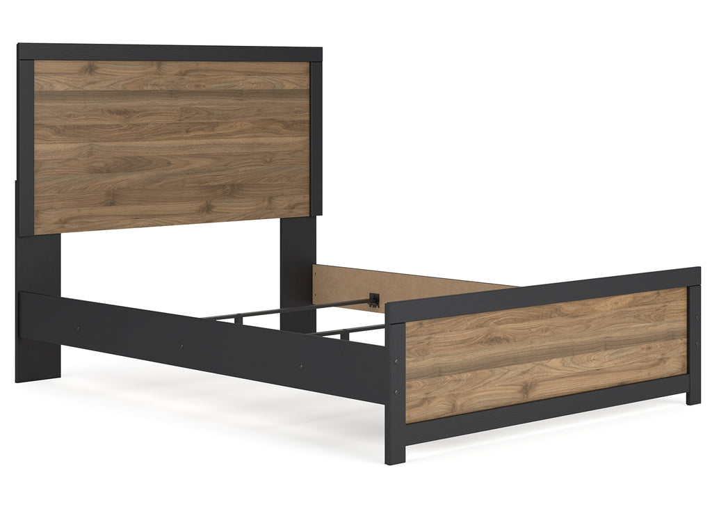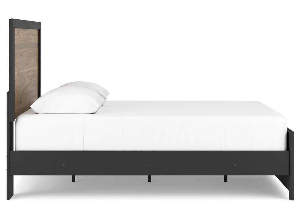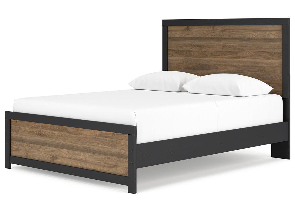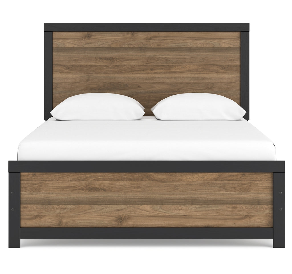 Relaxed yet striking, this queen panel bed brings casual beauty and function to your dream destination. The delightful two-tone treatment blends a fresh replicated walnut grain with a matte black finish that's easy to love. Its simplicity lends a contemporary touch that suits your bedroom's style to a T. | Product Features