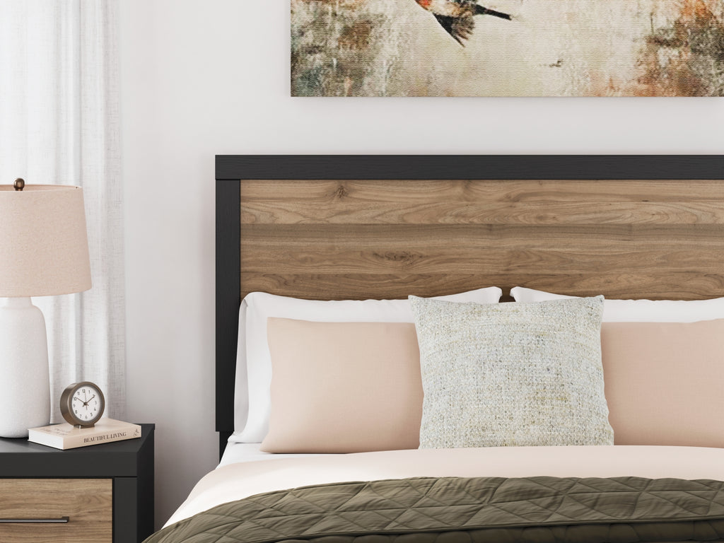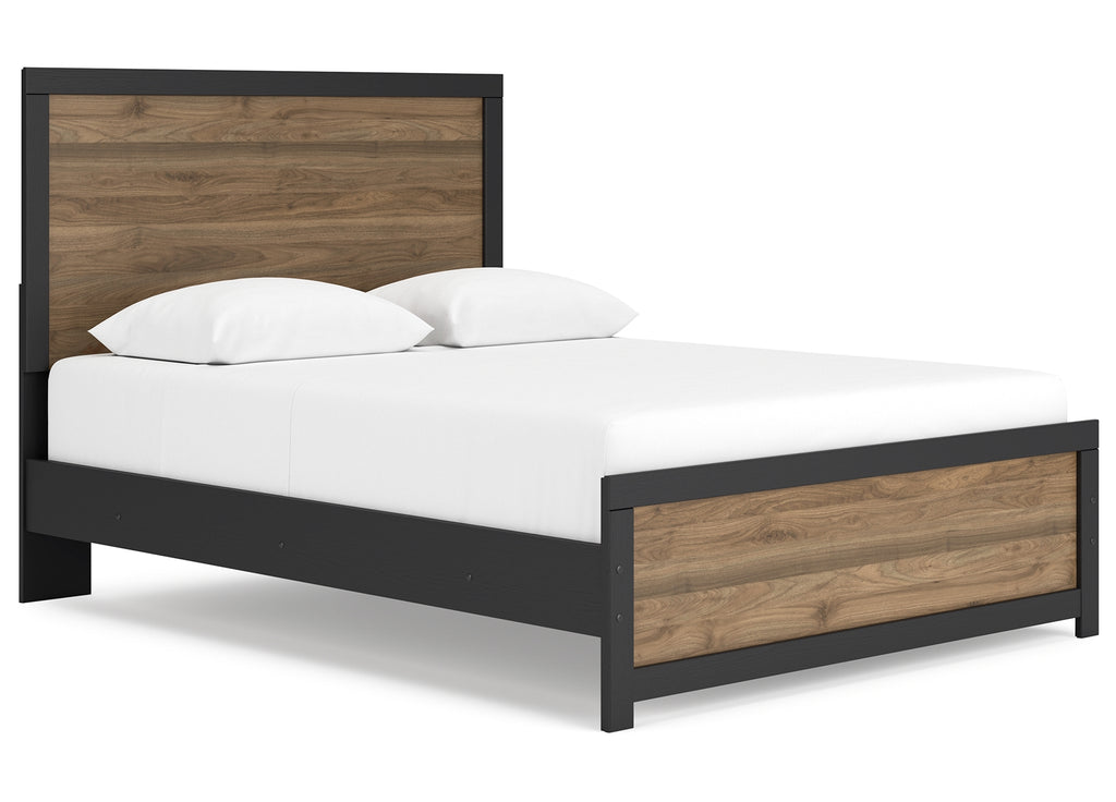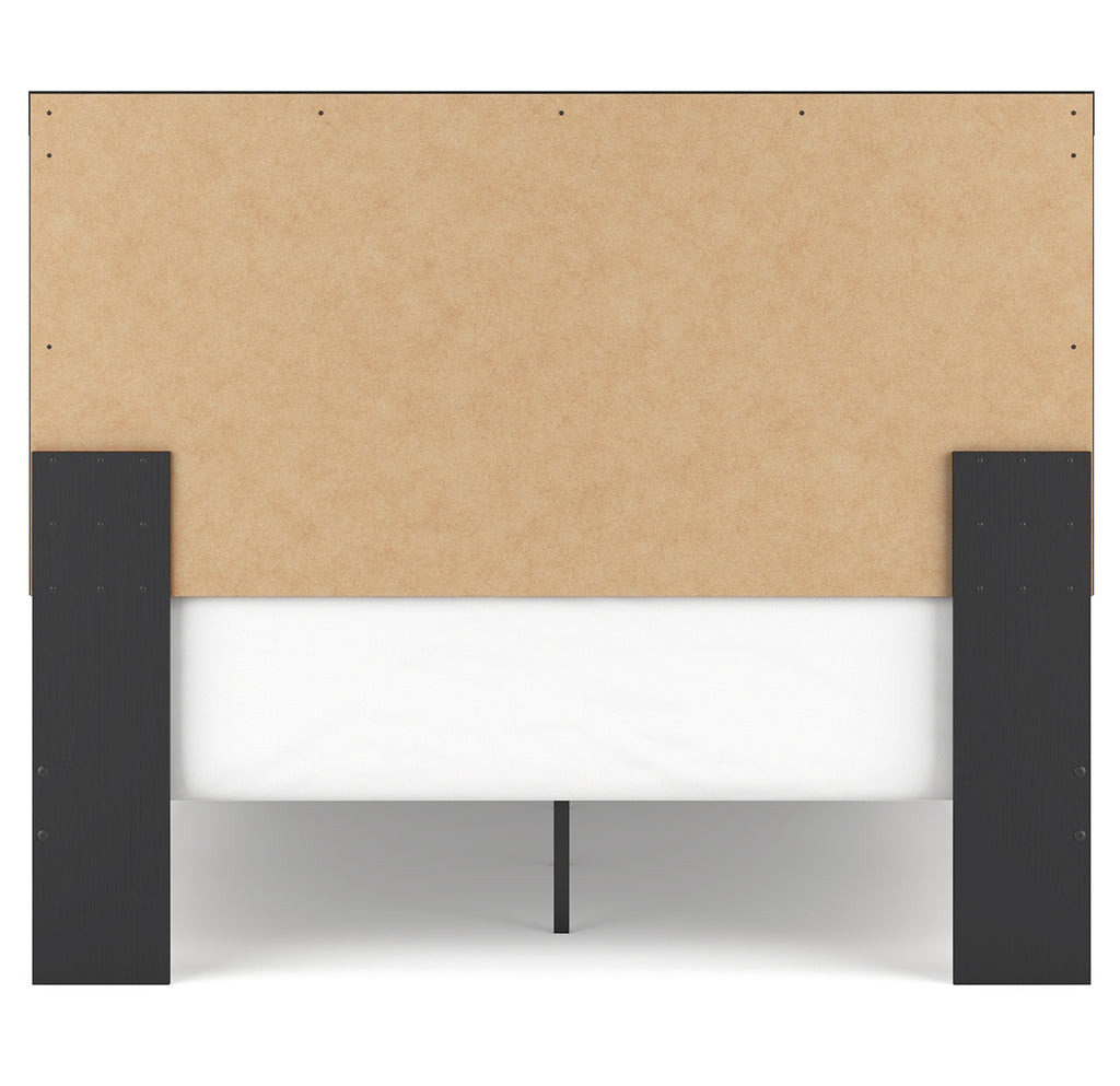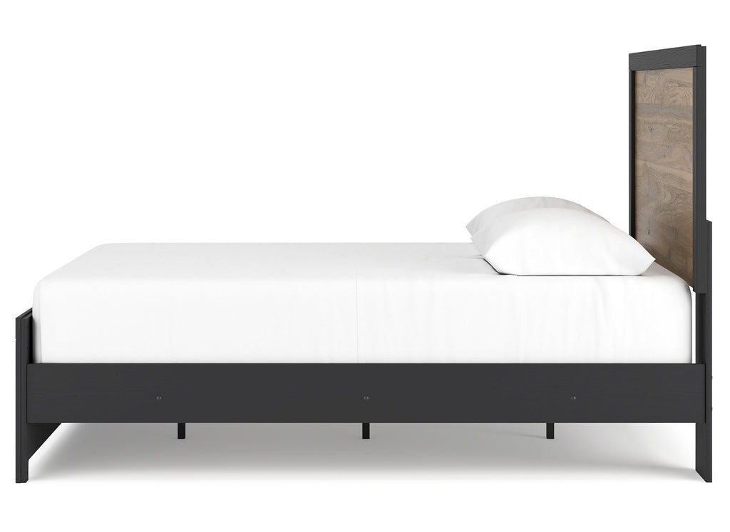 Relaxed yet striking, this queen panel bed brings casual beauty and function to your dream destination. The delightful two-tone treatment blends a fresh replicated walnut grain with a matte black finish that's easy to love. Its simplicity lends a contemporary touch that suits your bedroom's style to a T. | Product Features