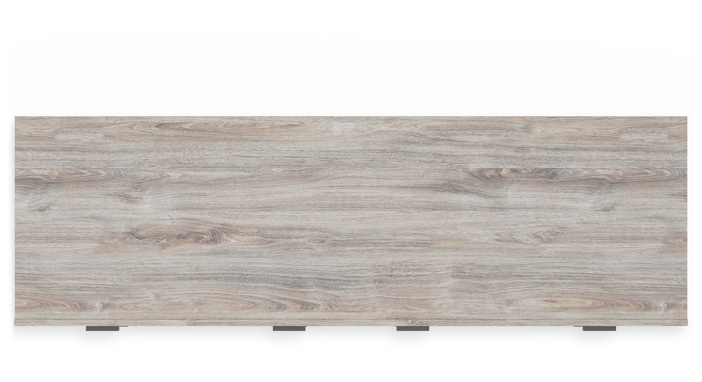 - Light gray finish over a replicated oak grain with authentic touch; base has matte black finish with subtle replicated wood grain