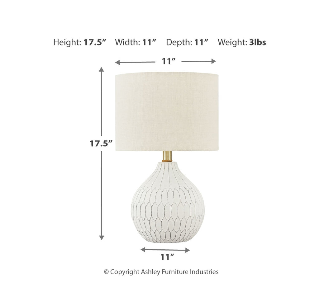 Fresh and light, the dimensional design of this delightful ceramic table lamp borrows from a retro theme to update a transitional space. Made of ceramic with an antiqued white finish, this accent lamp infuses personality into any setting. Add it to a console or end table and bring out the bright in any decor. | Product Features