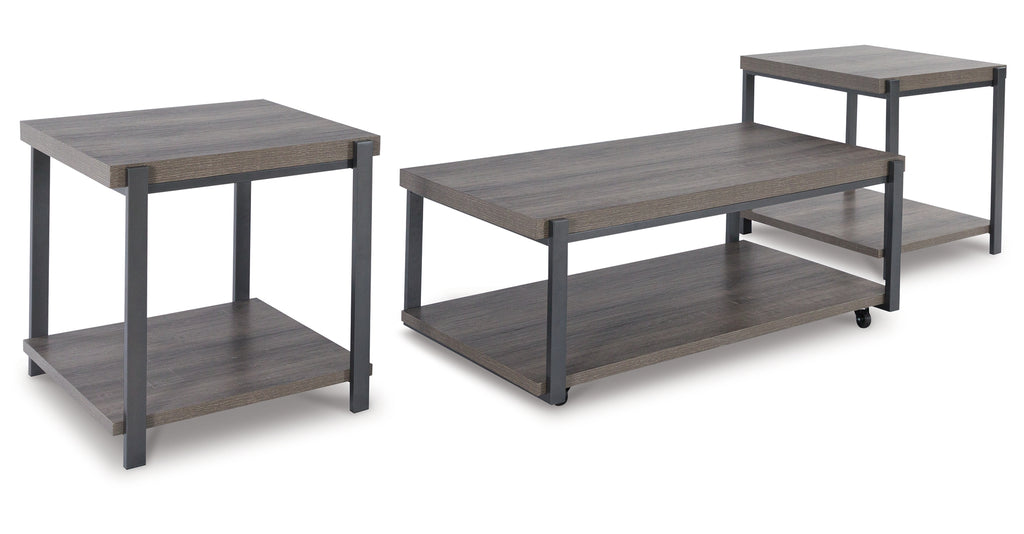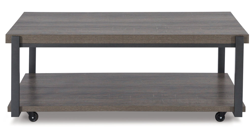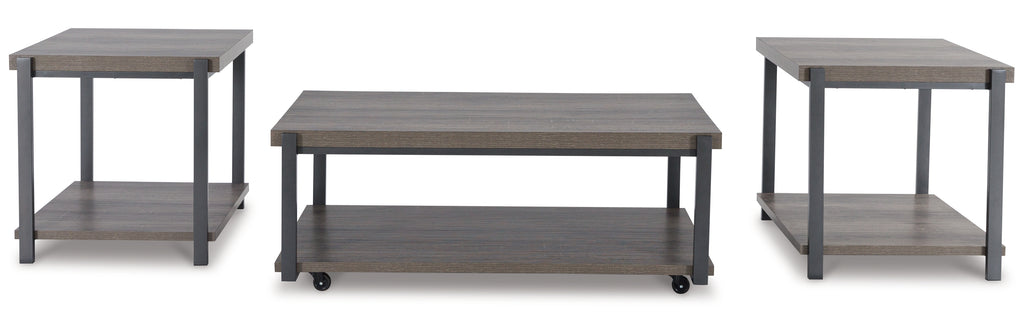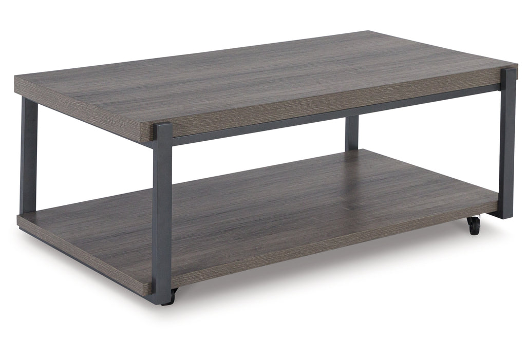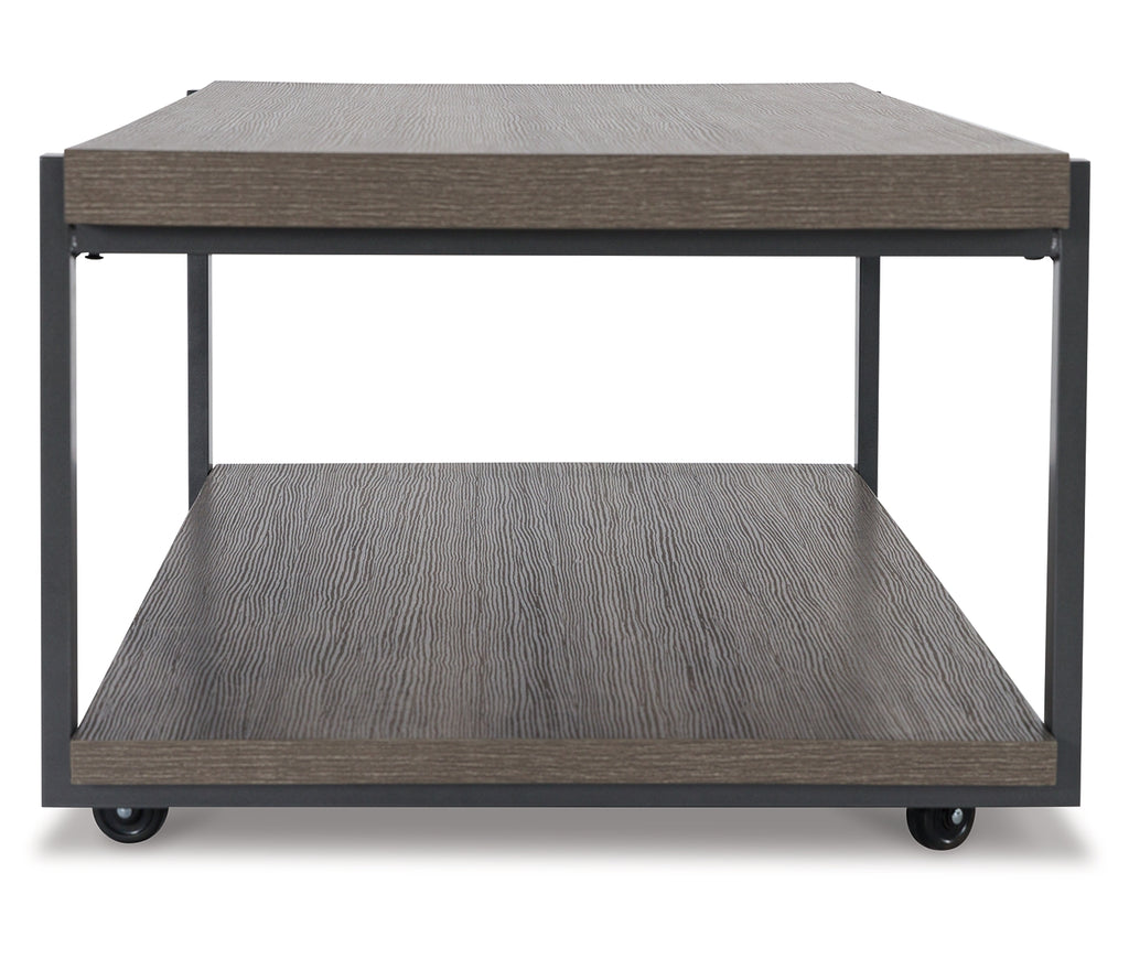 A cohesive, casual contemporary ensemble. This table set is equal parts sleek form and routine practicality. If you're hosting guests or need space to stretch out in a recliner, rolling casters on the coffee table clear up extra floor space in a snap. Each table is outfitted with a lower shelf for chic storage and displaying decor. | Product Features