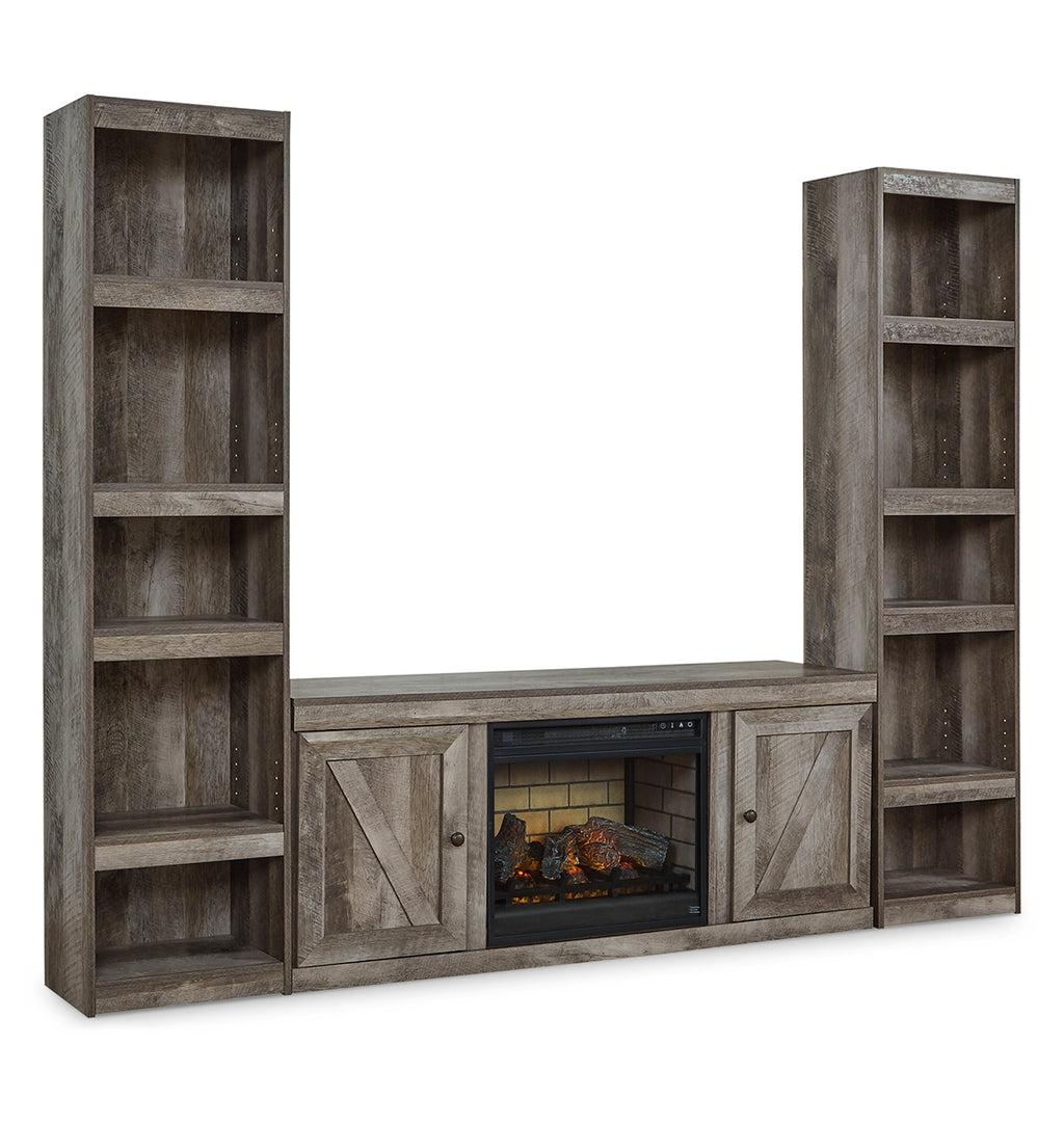 This entertainment center with electric fireplace is sure to win your heart with its fresh take on country living. Its crisp, clean and minimalist-chic profile is enriched with a gray finish, striking replicated oak grain and thick plank styling for that much more authentic character. Crossbuck detailing adds a brilliant barn door-inspired touch. There's ample storage room, as well as plenty of open shelf space to showcase home accents, safely out of the way. What really turns up the heat: an electric infrared fireplace insert with faux firebrick surround that operates with or without infrared heat. With the touch of a button, adjust the temperature and the flame brightness, and set the timer for long-lasting enjoyment. | Product Features