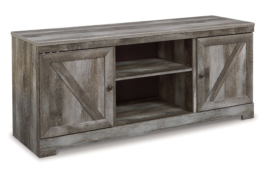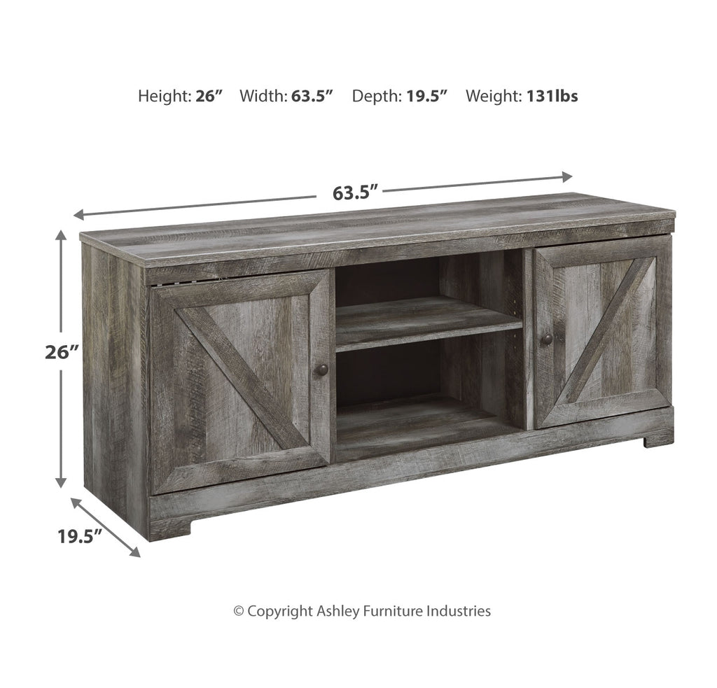 This TV stand with fireplace option is sure to win your heart with its daring designer take on modern rustic. The stand’s crisp, clean and minimalist-chic profile is enriched with a striking replicated oak grain with thick plank styling and a weathered gray finish for that much more authentic character. Crossbuck detailing adds a brilliant barn door inspired touch. Compatible with W100-101 and W100-02 electric fireplace inserts, sold separately. | Product Features