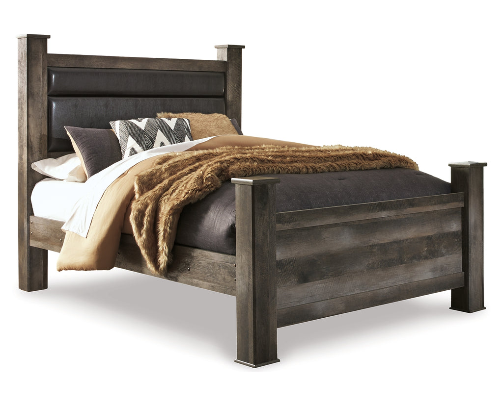 This queen upholstered poster bed is sure to win your heart with its daring designer take on modern rustic. The crisp, clean and minimalist-chic profile is enriched by a striking replicated oak grain with thick plank styling and a weathered gray finish for that much more authentic character. A padded black faux leather upholstered headboard with deep channeling adds flair and a sumptuous feel. | Product Features