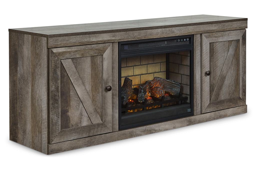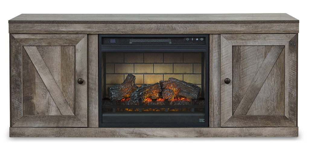 This TV stand with LED fireplace insert is sure to win your heart with its daring designer take on country living. Its crisp, clean and minimalist-chic profile is enriched with a gray finish, striking replicated oak grain and thick plank styling for that much more authentic character. Crossbuck detailing adds a brilliant barn door-inspired touch. What really turns up the heat: an electric infrared fireplace insert with faux firebrick surround that operates with or without infrared heat. With the touch of a button, adjust the temperature and the flame brightness, and set the timer for long-lasting enjoyment. | Product Features