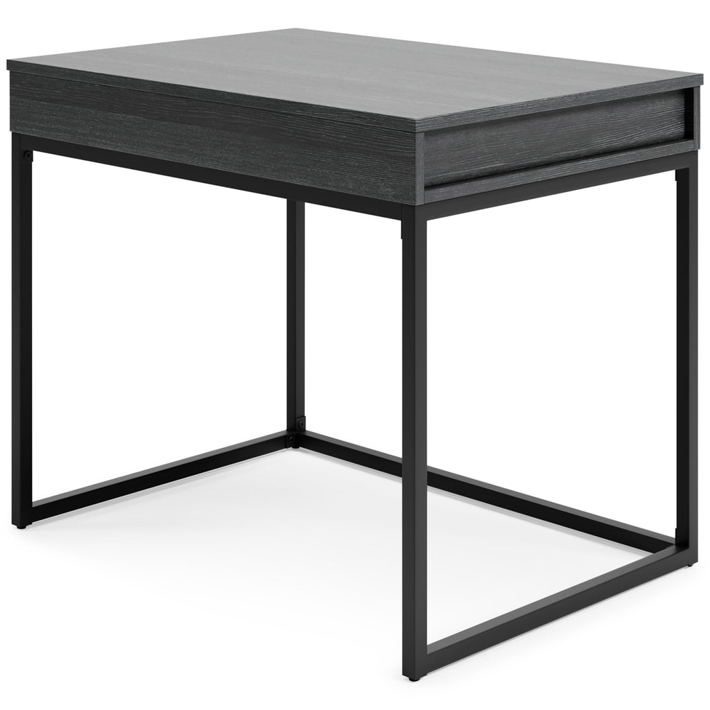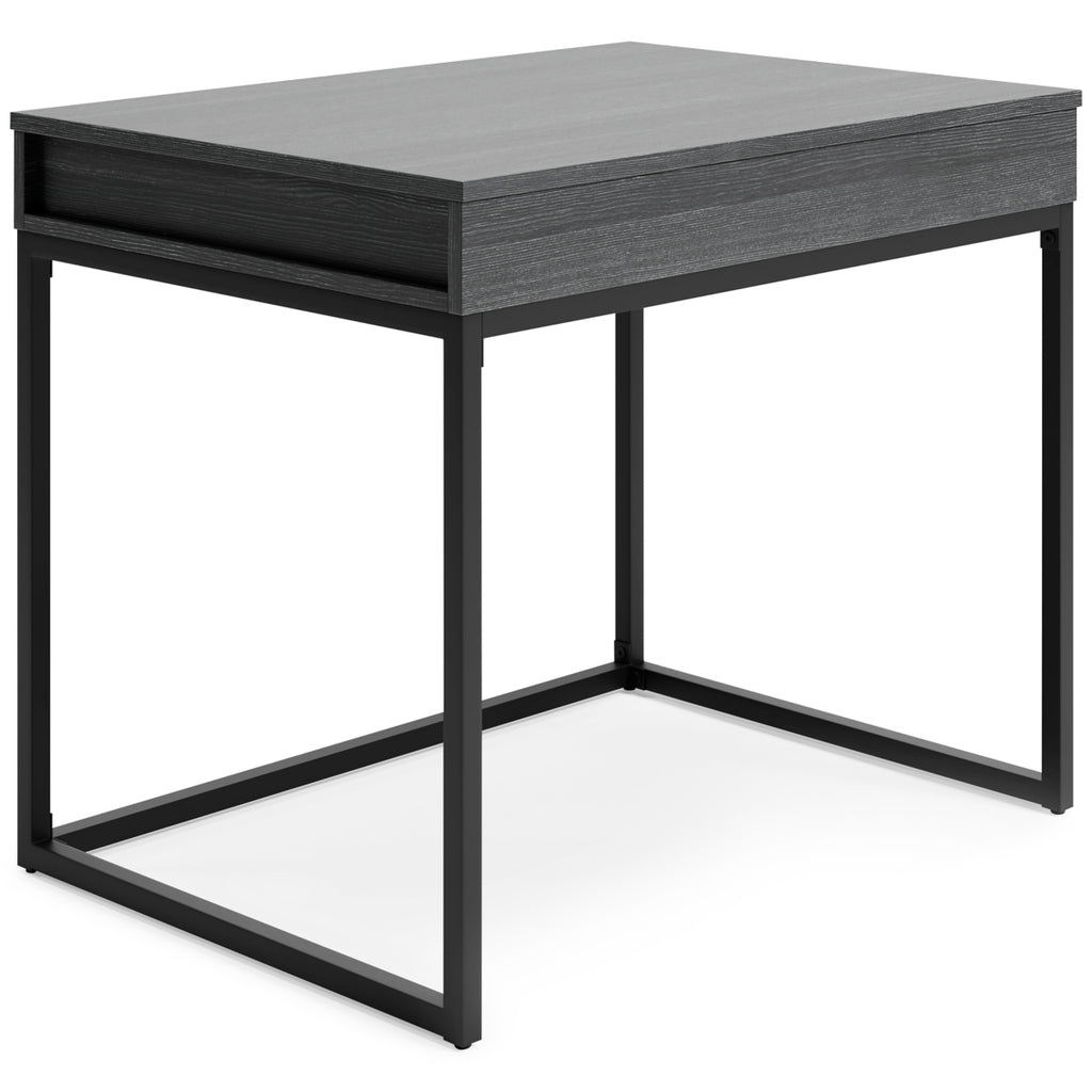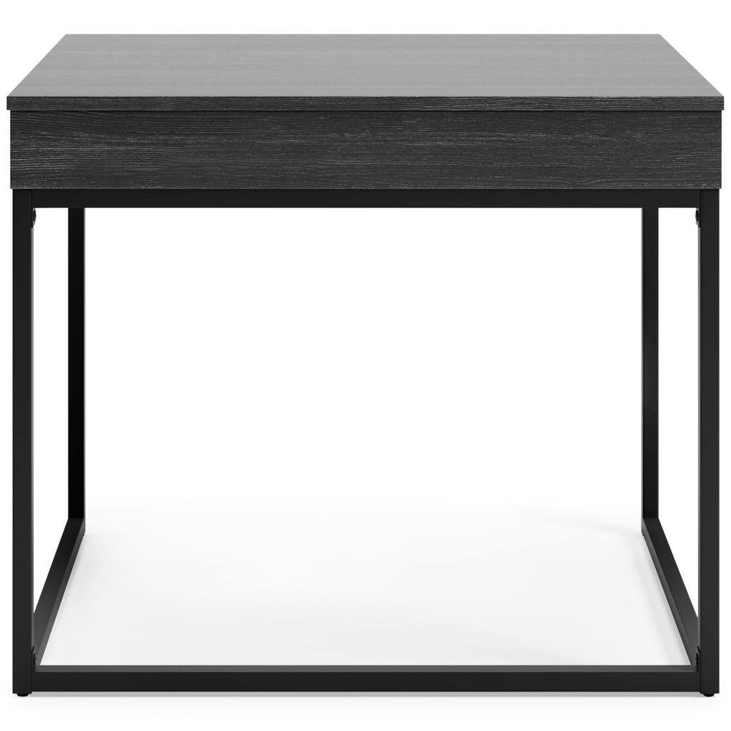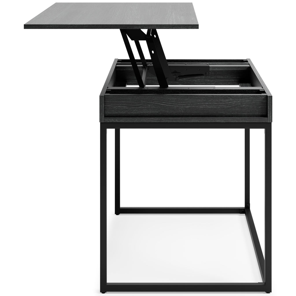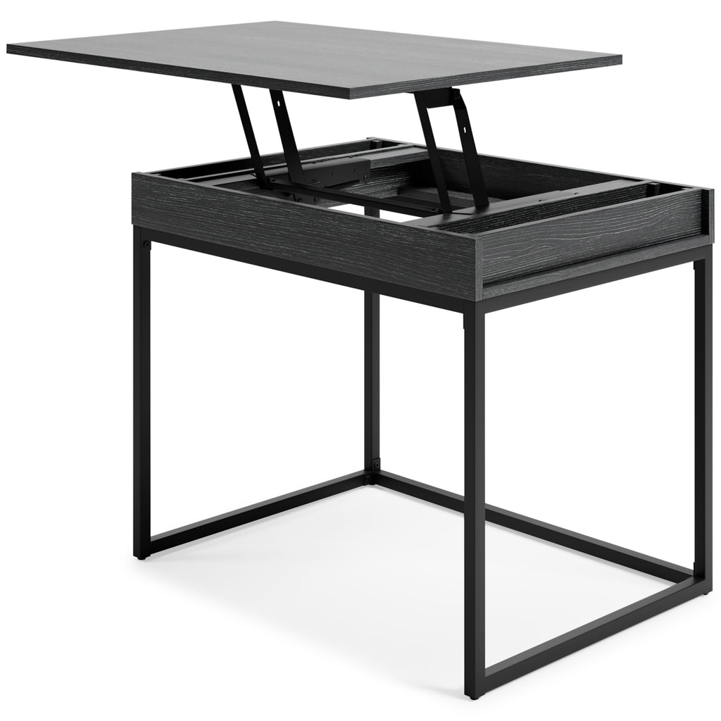 Elevate your home office with this simply sensational lift-top desk. Pairing a dark wood grain look with a black metal base for modern appeal, this minimalistic desk is dressed to impress in a no-muss, no-fuss way. Small storage bins underneath the sleek lift top bring added function. | Product Features