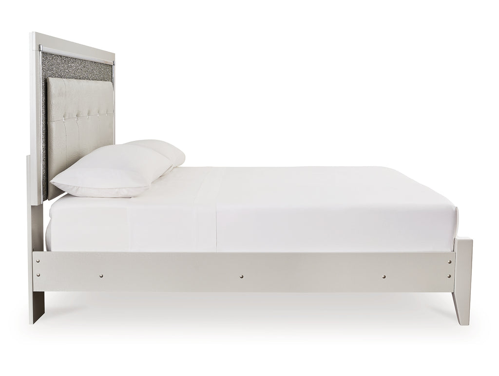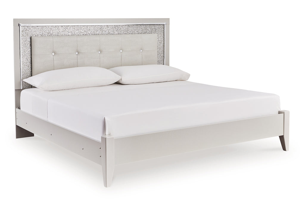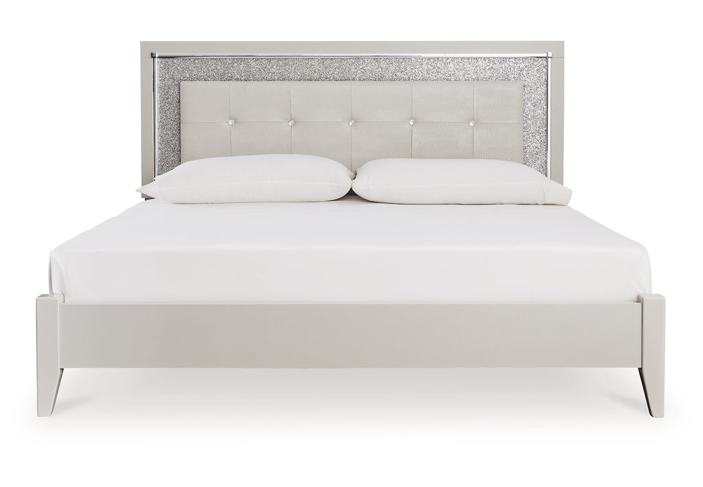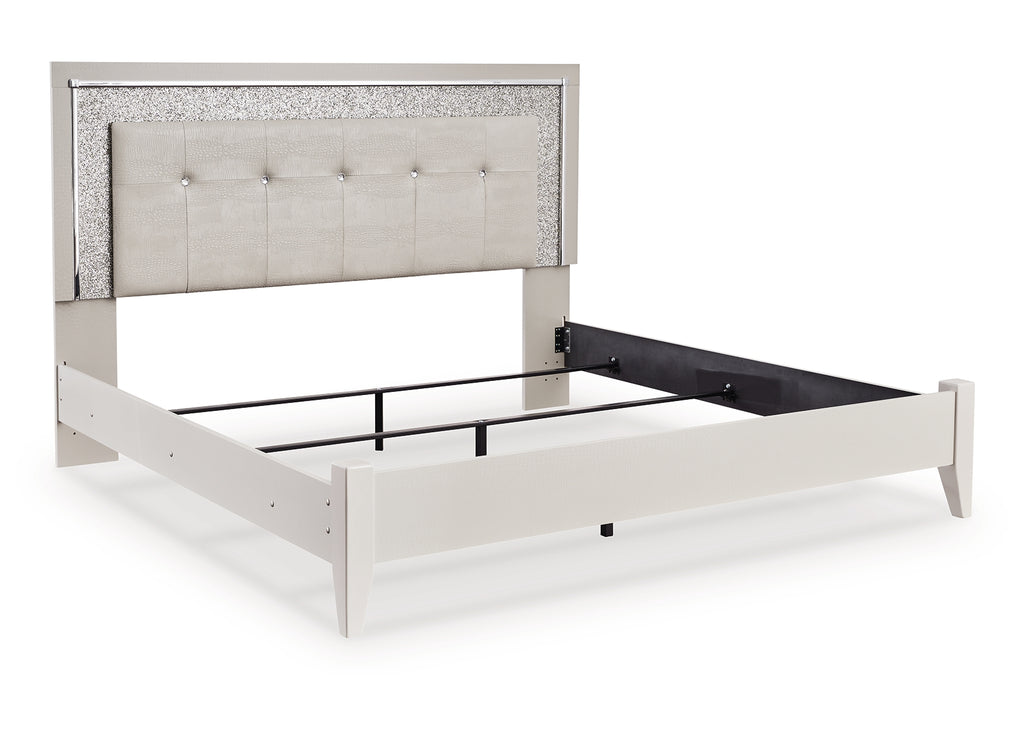 Bright, bold luxury. This king upholstered bed dazzles with its attention to detail. Your love of glamorous style is reflected in the tufted upholstery with faux alligator effect, exquisitely paired with faceted chrome-tone and glittery details. Complete with LED lighting around the headboard, it inspires you to live luxuriously every day—from waking up to reading before bed. | Product Features